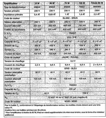 Le tableau suivant résume les tensions, l'intensité des courants, les tensions après redressement, le calibre des fusibles et les références des transformateurs secteur.